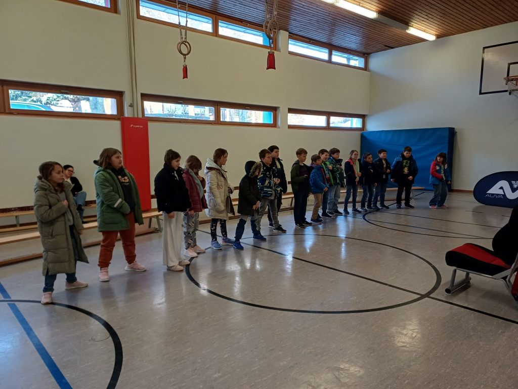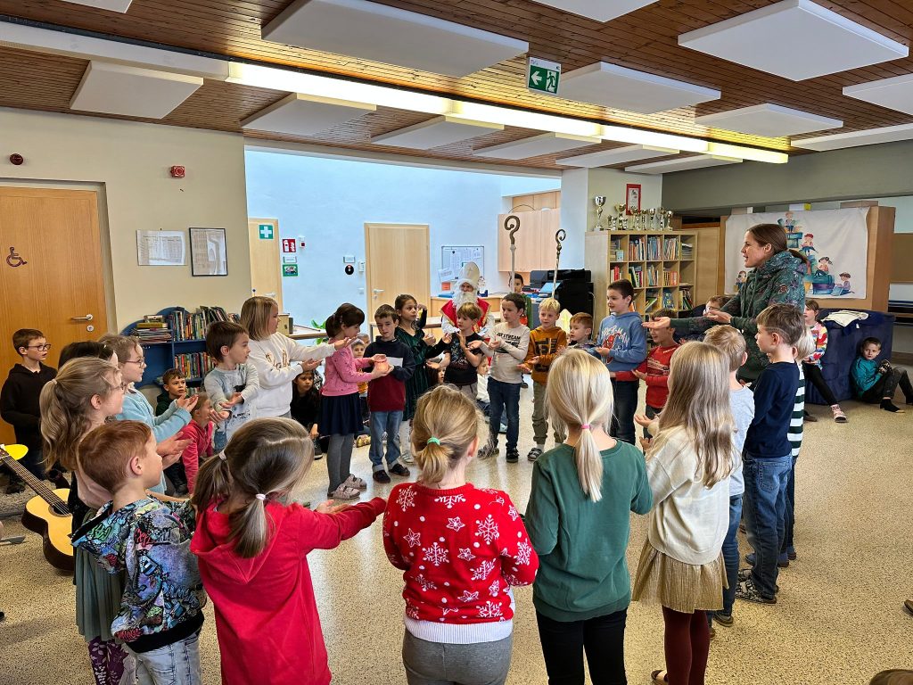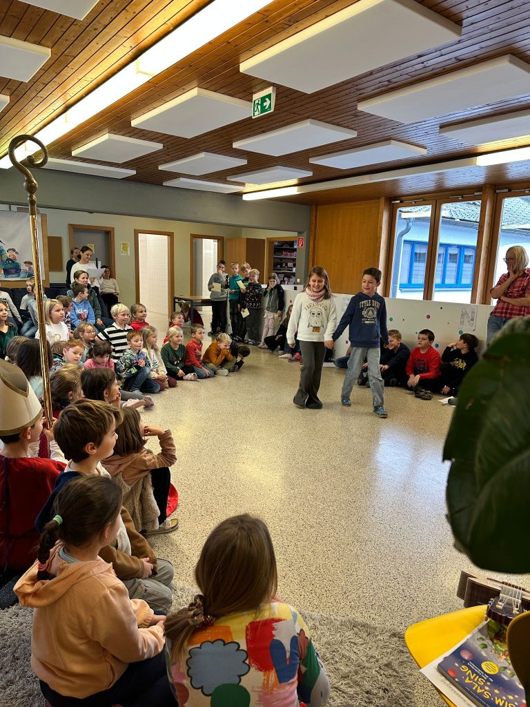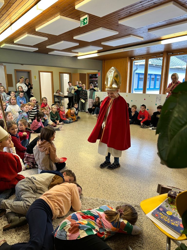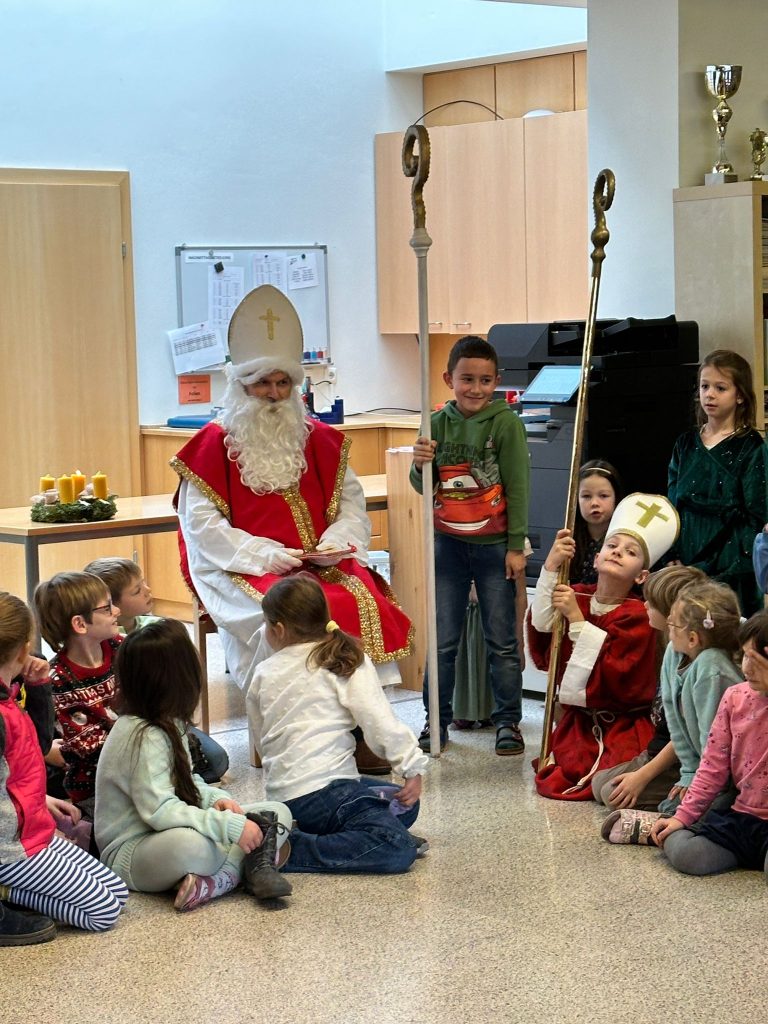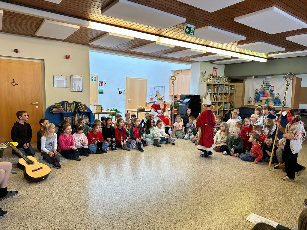 Am 6. Dezember kam der Nikolaus zu uns in die Schule. Die erste Klasse sang ein Lichterlied, die zweite Klasse “Kinder stellt die Stiefel raus”. Eine Nikolausgeschichte präsentierte die 3a und die 3b einen Rap. Der abschließende Beitrag der Kinder war ein Gedicht mit Body Percussion der 4. Klasse. Gemeinsam sangen wir “Lasst uns froh und munter sein” und jede Schulklasse erhielt vom Nikolaus einen gefüllten Sack mit Leckereien.
