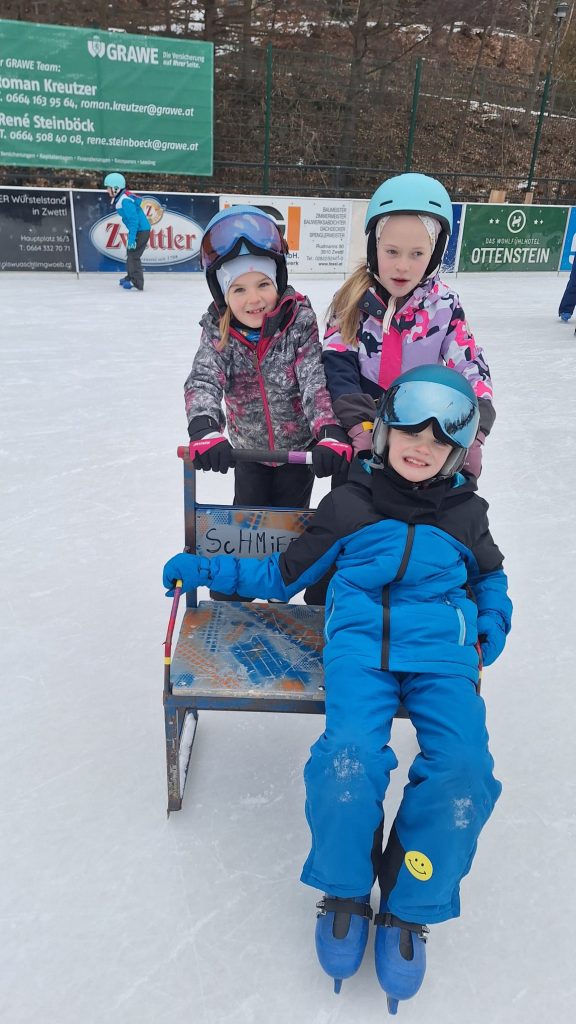 Alle Kinder der Volksschule fuhren mit dem Bus nach Zwettl zum Eislaufplatz. Dort verbrachten wir den Vormittag am Eis und liefen viele Runden auf der großen Eisfläche. Besonders ansprechend und immer in Verwendung waren die “Transportsessel” . Vielen Dank an alle helfenden Eltern, die uns unterstützt haben!