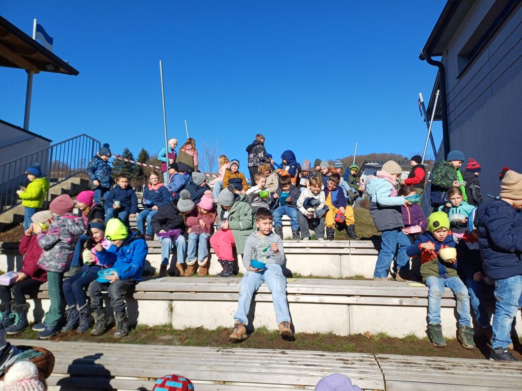 An einem richtig kalten Tag starteten wir unseren Wandertag nach Braunegg. Alle hatten einige Schichten angezogen und bergauf wurde uns ganz bald warm. Nach 8,5 Kilometern, vorwiegend bergauf, sind wir an der Aussichtsplattform und am Spielplatz in Braunegg angekommen. Mit Bravour hat die Waschbärenklasse den Weg gemeistert!