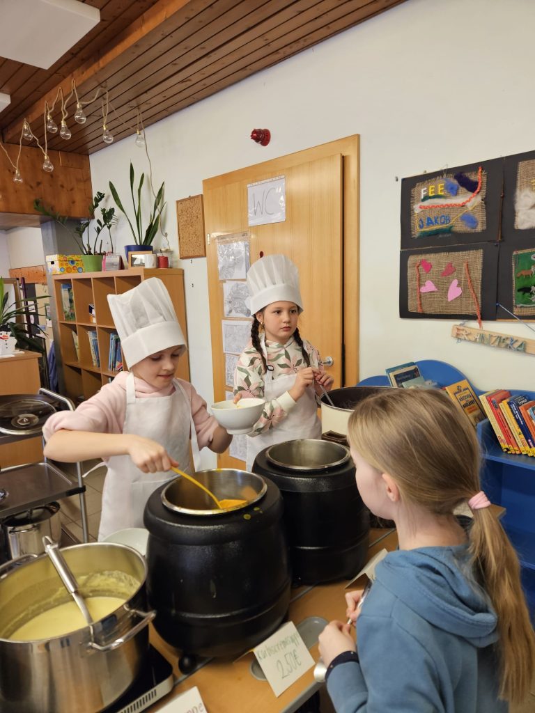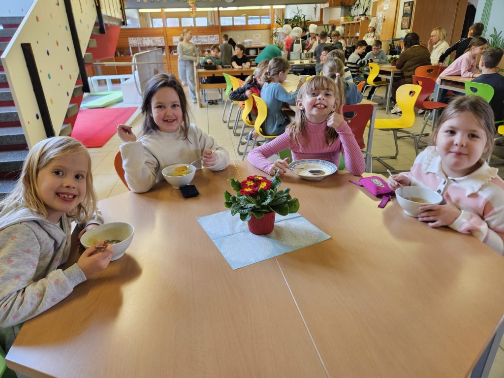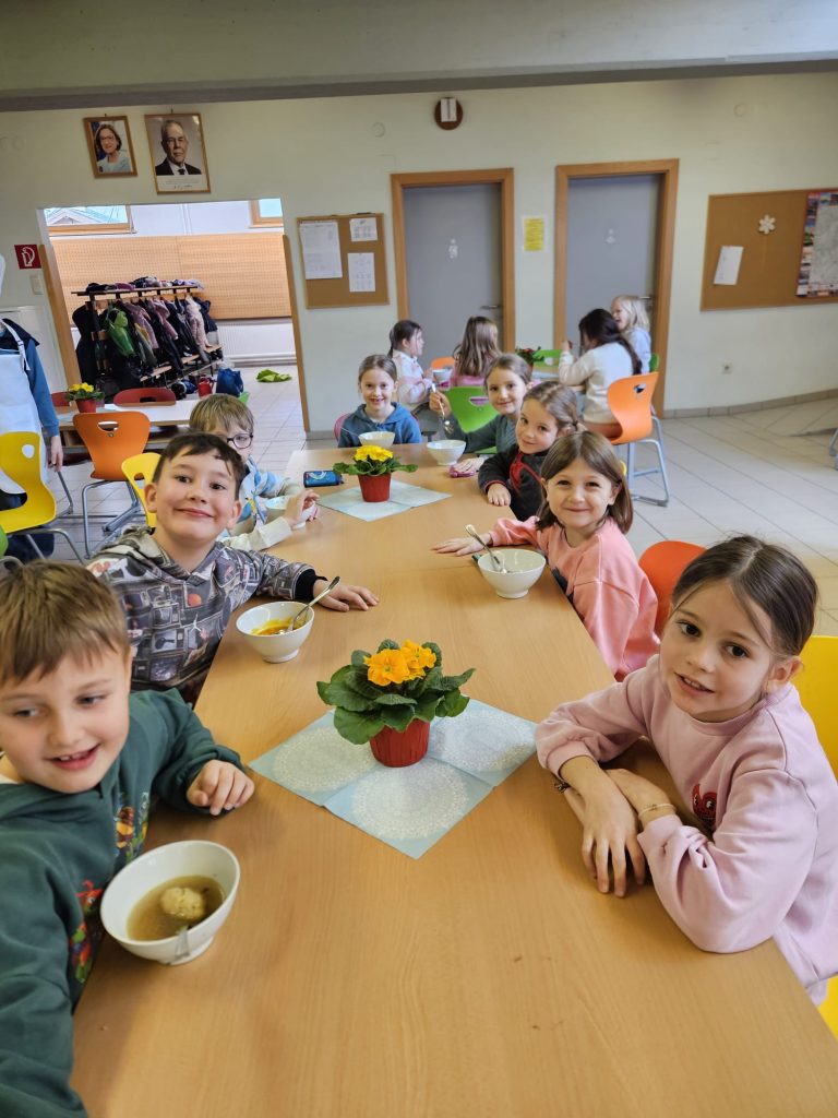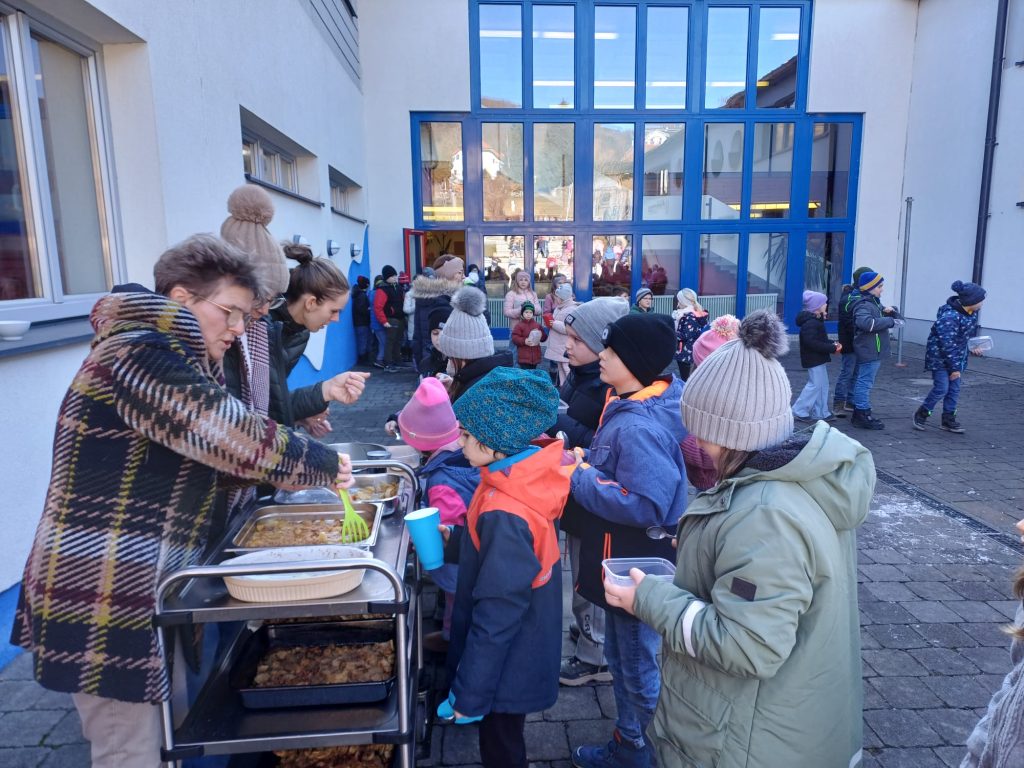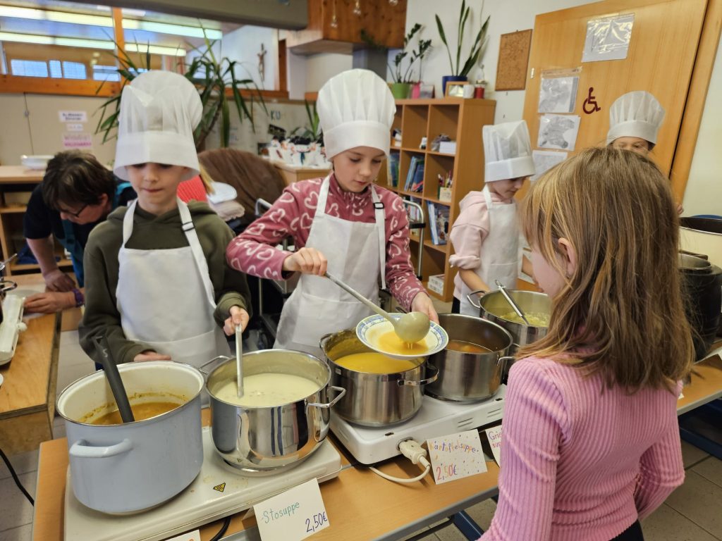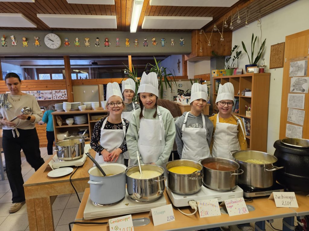 Am Vormittag hatten die Schülerinnen und Schüler die Möglichkeit, sich eine Fastensuppe zu kaufen. Organisiert wurde das Suppenessen von der 4. Klasse. Es gab die unterschiedlichsten Suppen zur Auswahl. Alle schmeckten den Kindern sehr gut und sie genossen die gemeinsame Mahlzeit in fröhlicher Runde!