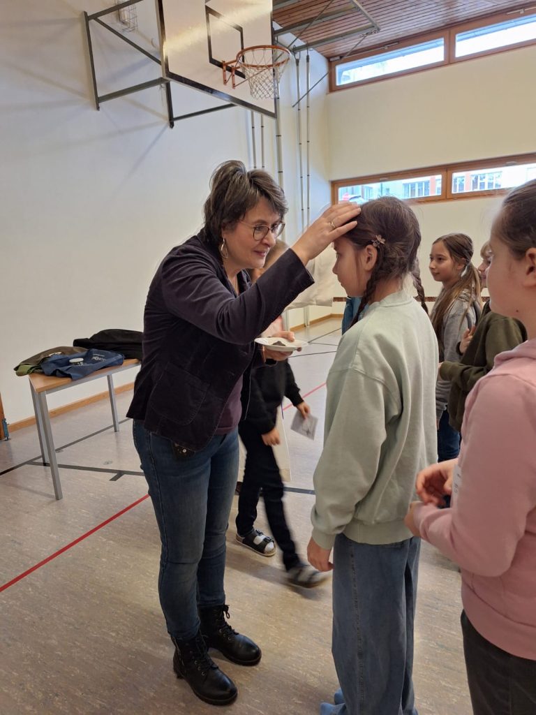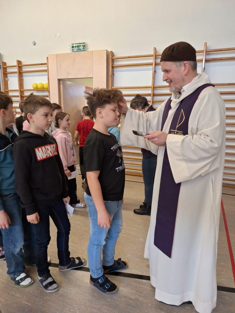 Den Aschermittwoch begannen wir in der Schule mit einer religiösen Feier im Turnsaal. Pfarrer Oliver und unsere Religionspädagogin Izabela Nödl spendeten den Kindern das Aschenkreuz.